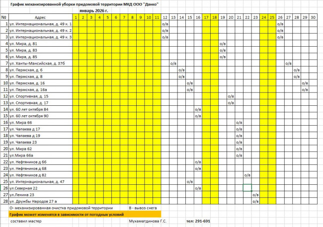 График очистки придомовых территорий домов от снега. Данный график может изменяться и корректироваться в зависимости от погодных условий.
